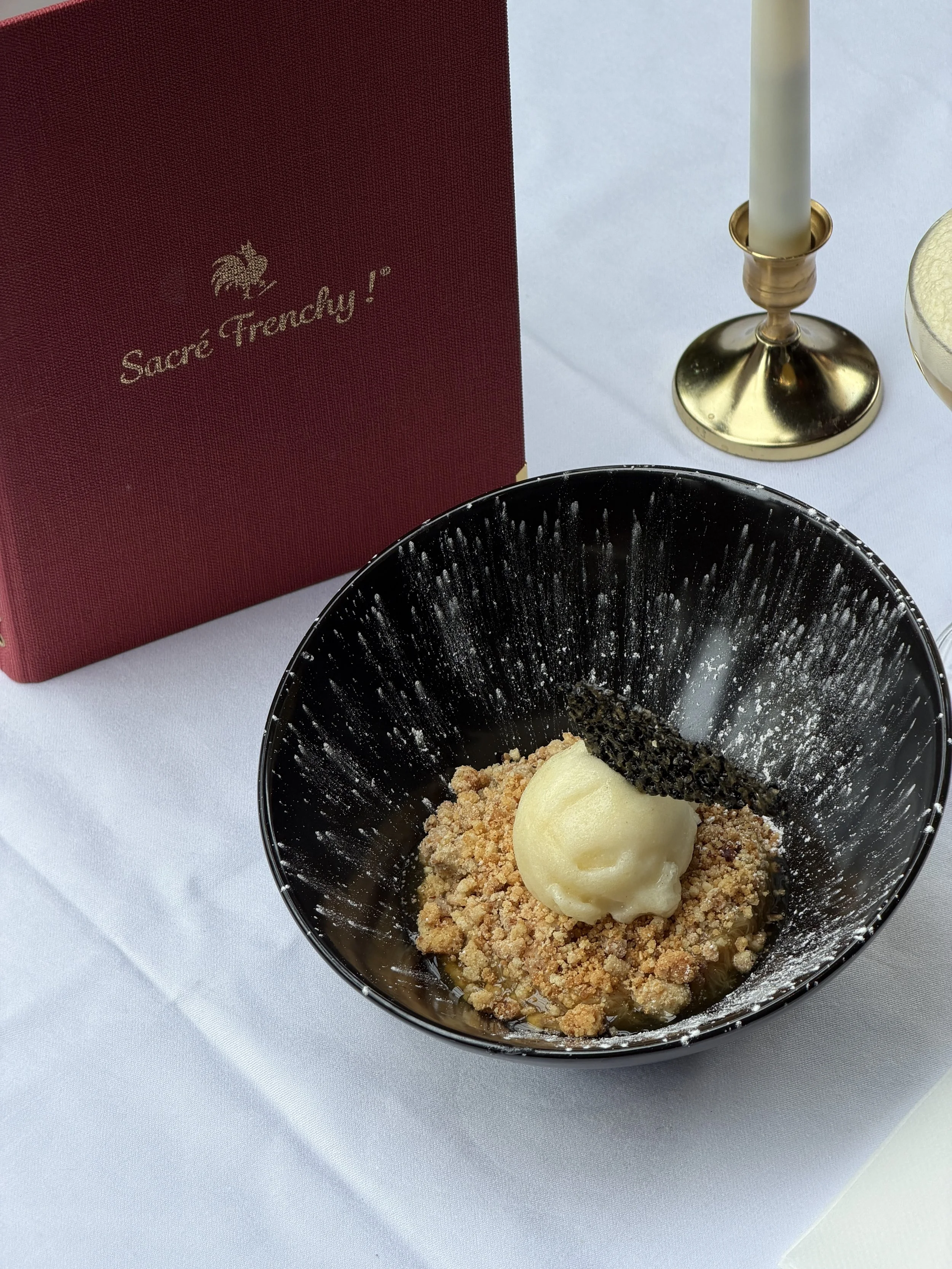 Crumble de Rhubarbe au Romarin — Servi avec glace yaourt de St Malo (Végétarien). 🍧